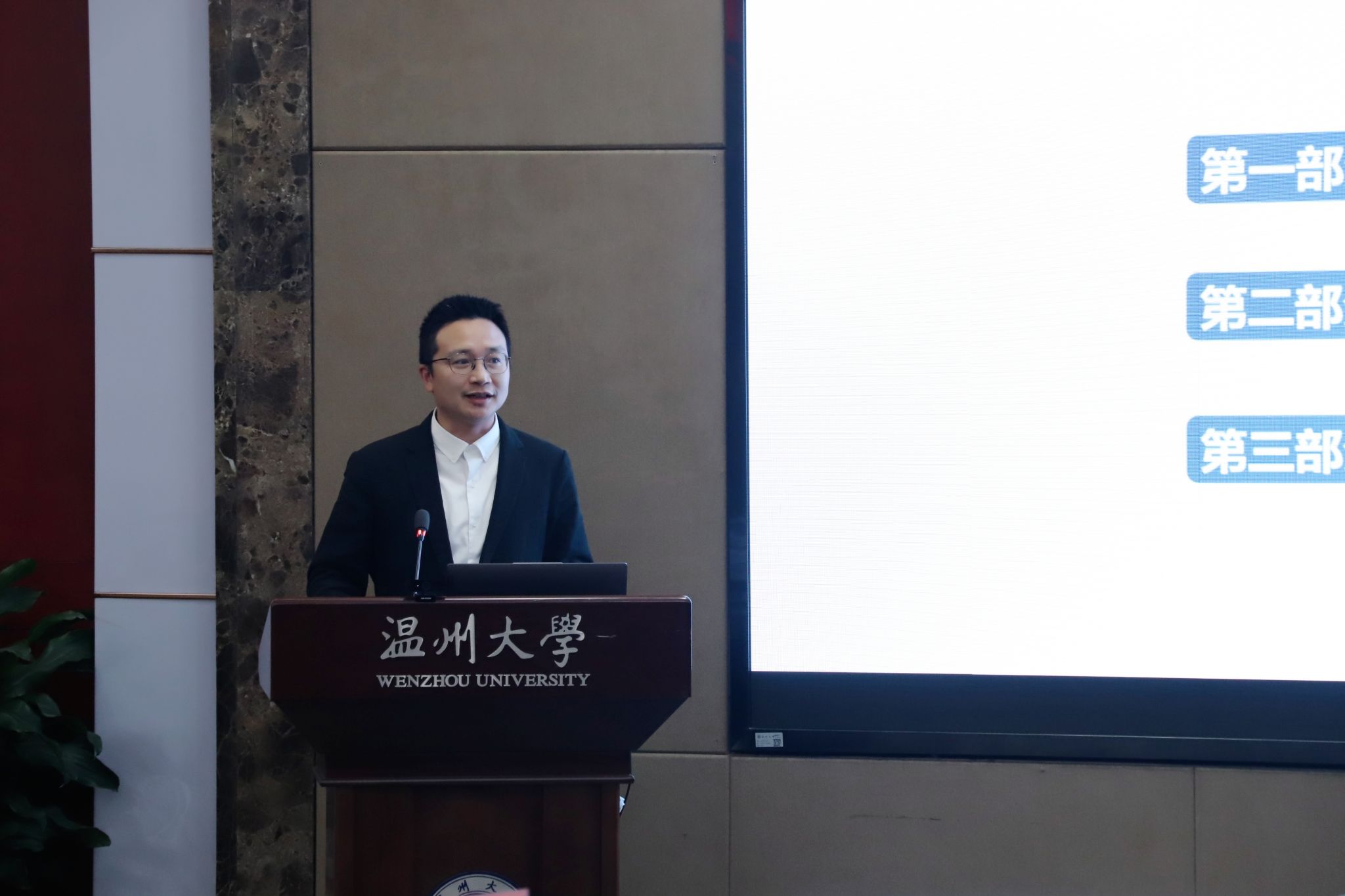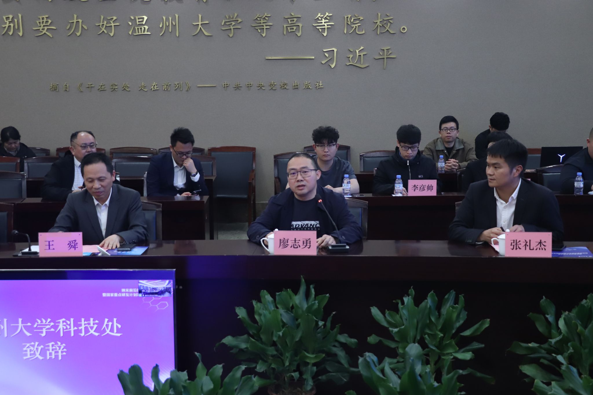 温州大学科技处处长廖志勇教授讲话,他向对长期关心支持温州大学科研事业发展的各界同仁致谢,并表示温州大学将始终依托"预研-孵化-中试"全链条支持体系,强化有组织的科研保障,并联合优势单位,推动多学科协同攻关,力求为我国新能源材料产业发展提供关键技术支撑。