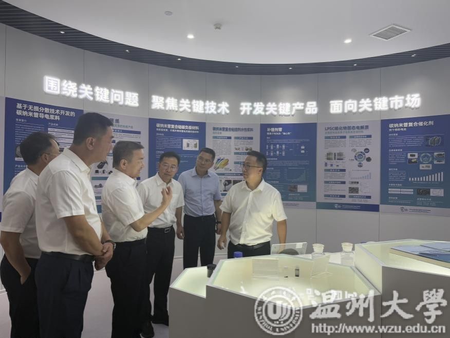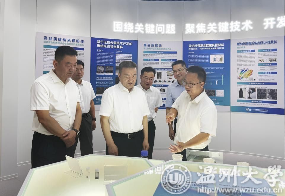 7月24日,浙江省委常委、政法委书记王成国在温州洞头、乐清、瑞安等地宣讲省委十五届七次全会精神,并来我校碳材料与氢能产业技术研究院(以下简称“碳氢院”)调研指导工作。浙江省委政法委副书记叶新,温州市副市长、市委政法委副书记毛伟平,温州大学党委书记钱强,瑞安市委书记李坚,温州市委政法委常务副书记连正坚陪同调研。