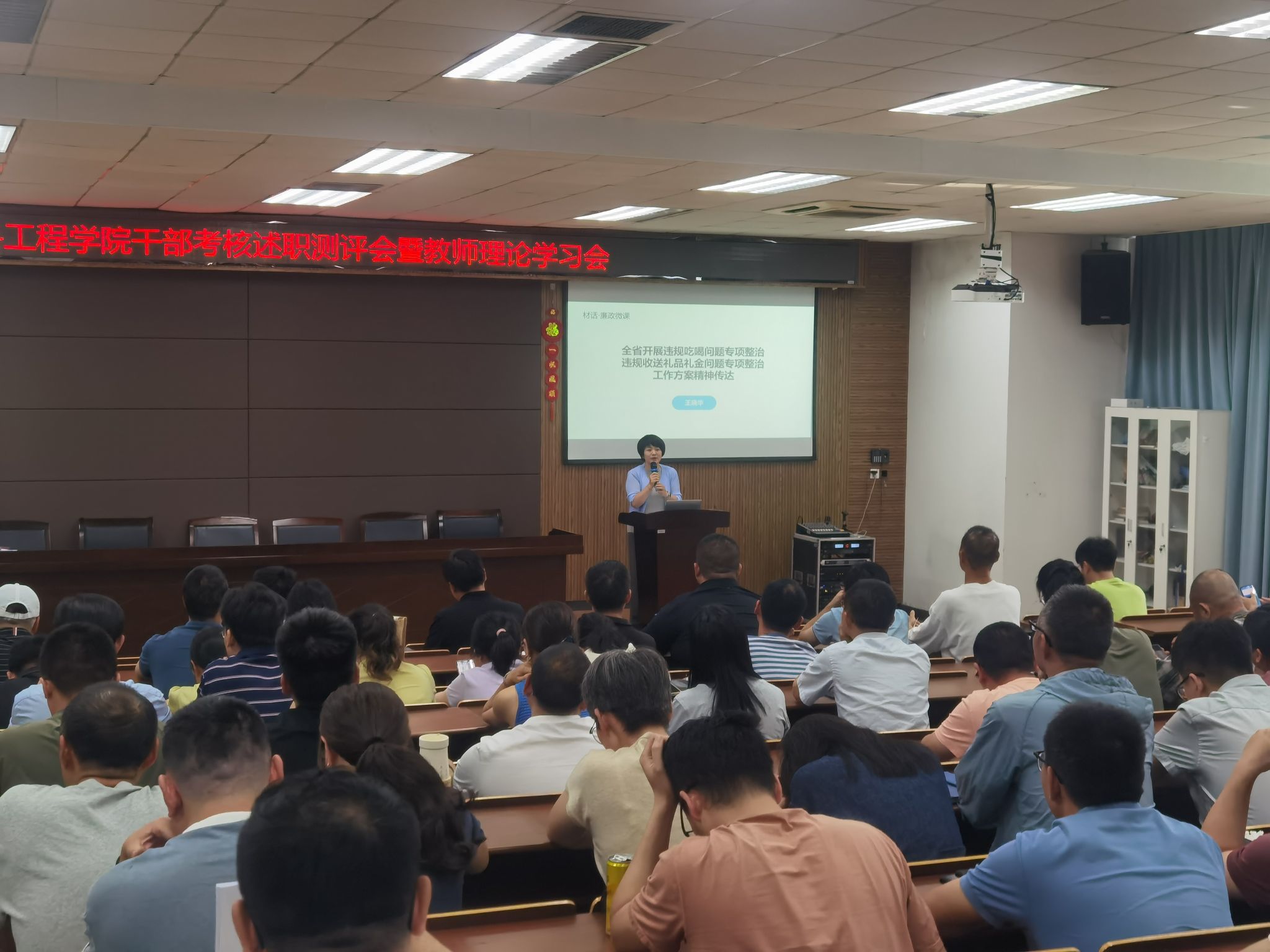 学院党委副书记、纪委书记王晓华传达全省开展违规吃喝问题专项整治、违规收送礼品礼金问题专项整治工作方案精神。她解读整治工作的目标、范围、重点内容及要求,传达“七禁”规定,要求全体教职工严守纪律,自觉抵制违规吃喝、违规收送礼品礼金等不正之风,共同营造风清气正的校园环境。