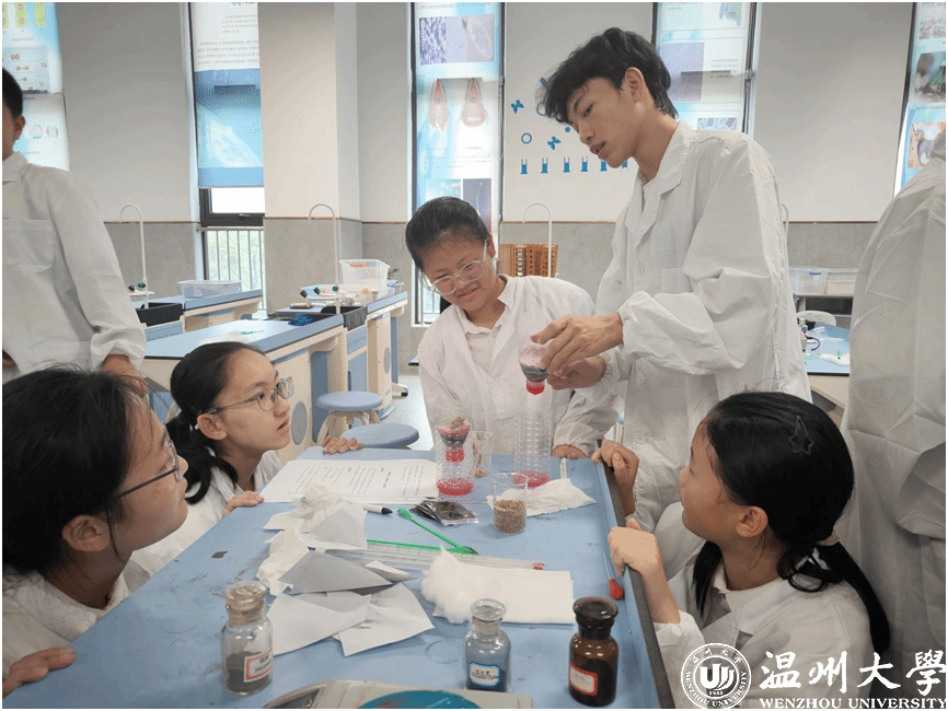 “同学们知道‘大象牙膏’为什么会喷发吗?这背后是双氧水分解的化学反应……”在温州市第八中学的实验室里,He-406实践队队员李同学正带领初中生进行趣味实验。