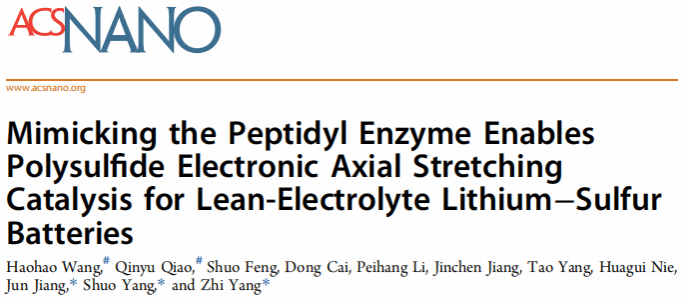 该工作以“Mimicking the Peptidyl Enzyme Enables Polysulfide Electronic Axial Stretching Catalysis for Lean-Electrolyte Lithium-Sulfur Batteries”为题发表于国际顶级期刊《ACS Nano》(IF=16.0)。温州大学作为第一通讯单位,我校电气与电子工程学院2021级硕士研究生王浩浩为第一作者,中国科技大学硕士研究生乔钦宇为共同第一作者,我校杏吧视频