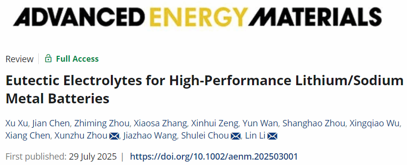 近日,我院侴术雷教授、李林特聘教授课题组在国际权威期刊Advanced Energy Materials发表题为“Eutectic Electrolytes for High-Performance Lithium/Sodium Metal Batteries”的综述文章。该综述聚焦近年来在共晶电解液领域的研究进展,系统梳理了其在锂/钠金属电池中的应用潜力与关键挑战。本文从共晶电解液的形成机制出发,详细探讨其物理化学特性并系统总结了其在提升循环稳定性、快充能力、高电压兼容性与温度适应性等方面的进展,并展望了未来的研究方向。该综述为高性能锂/钠金属电池电解液系统的分子设计与界面调控提供了重要参考。2024年最新杏吧视频官方网站相关的文章发表在Advanced Energy Materials上,温州大学为第一通讯单位,第一作者是我院2023级硕士研究生徐旭,我院侴术雷教授、李林特聘教授及周洵竹博士为共同通讯作者。相关工作受到国家自然科学基金,浙江省自然科学基金等基金的资助。