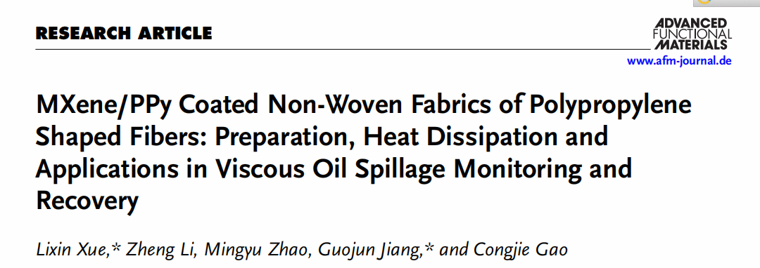 该研究成果以“MXene/PPy coated non-woven fabrics of polypropylene shaped fibers: preparation, heat dissipation and applications in viscous oil spillage monitoring and recovery”为题,发表在国际期刊《Advanced Functional Materials》上。该工作的指导老师包括温州大学薛立新研究员、浙江工业大学之江学院蒋国军副教授和膜分离与水科学技术中心高从堦院士,参与的研究生包括浙江工业大学李正博士和赵明宇硕士。