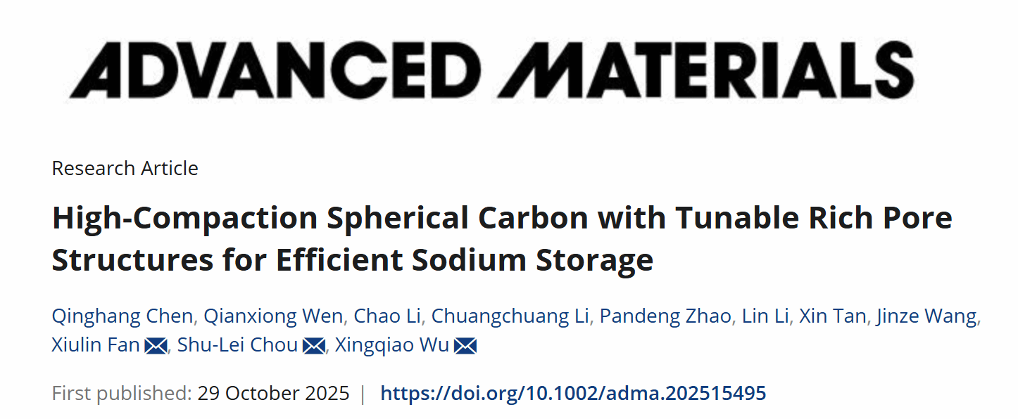 吴星樵/侴术雷联合浙江大学范修林提出了一种硬碳负极的多尺度孔调控策略,有效解决了兼顾高比容量与高体积容量这一长期存在的难题。实验数据与理论计算表明,在水热过程中,乙酸改变了水热炭的疏水性,促进了分散性球形颗粒的形成,并提升了材料的压实密度。预孔工程策略可增加水热炭的自由体积与开放孔结构:其中,酯化反应形成的自由体积有利于最终硬碳中封闭孔结构的构建,而氧化刻蚀产生的开放孔则便于硬碳后续形成微孔结构。得益于对硬碳材料微观与介观尺度的双重调控,该材料展现出优异的电化学性能,其可逆容量达 375.40 mAh/g,首次库伦效率达 90.10%。当厚电极受到更高压实处理时,其球形形貌使其仍能保持较高的克容量(359.49 mAh/g),同时体积比容量得到提升(390.30 mAh/cm³)。与普鲁士蓝正极组装成扣式全电池时,电池能量密度高达 318.44 Wh/kg。值得注意的是,在宏观层面阐明了在低电位下,实验室规模与实际应用级电极中钠嵌入及孔填充过程背后的机制,为开发高能量密度钠离子电池提供了宝贵指导。该研究成果以" High-Compaction Spherical Carbon with Tunable Rich Pore Structures for Efficient Sodium Storage"为题,发表在国际顶级期刊《Advanced Materials》上。我校为第一通讯单位,第一作者是我校杏吧视频