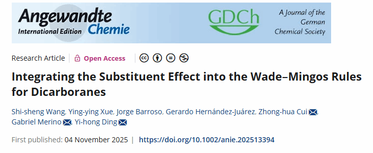 丁益宏教授团队联合吉林大学、墨西哥 Cinvestav-Mérida 大学科研力量,在硼簇化学结构预测领域取得突破性进展。相关研究成果以 “Integrating the Substituent Effect into the Wade–Mingos Rules for Dicarboranes” 为题,发表于国际顶级期刊《Angewandte Chemie International Edition》(DOI:10.1002/anie.202513394)。