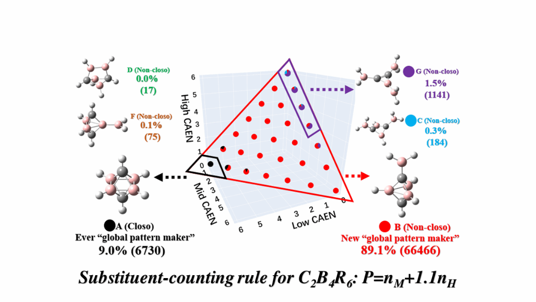 碳硼烷作为具有独特三维簇状骨架的电子缺陷化合物,在材料科学、生物医药等领域应用前景广阔,其结构稳定性与几何构型的精准预测是硼簇化学的核心研究方向。经典的 Wade-Mingos(W-M)规则长期指导硼烷、碳硼烷结构研究,但该规则仅聚焦簇合物骨架电子对计数,忽略了取代基效应,导致在取代碳硼烷体系中频繁出现预测偏差,严重限制了碳硼烷功能分子的定向设计。针对这一关键科学问题,团队开展大规模高通量计算与系统分析。研究选取 17 种典型取代基,在六顶点碳硼烷的 6 个取代位点进行组合,构建 74613 个独特的 C₂B₄R₆体系,通过 CBS-QB3 高水平能量计算(累计完成约 2.4 亿次结构能量评估),结合自主开发的 Seed and Mortise-Tenon(SMT)模型,系统揭示了取代基对碳硼烷基态结构的调控机制。研究发现,传统 W-M 规则预测的八面体结构仅在 9.1% 的体系中为基态,而此前被低估的三角双锥结构在 89.1% 的体系中成为全局最稳定构型。团队基于 “连接原子电负性(CAEN)” 将取代基分类,并提出简单实用的取代基计数规则(P = nM + 1.1nH),预测准确率达 92.8%,且在大位阻取代基体系中仍保持良好适用性。该规则突破了 W-M 规则仅在单一取代基环境中有效的局限,可覆盖绝大多数取代基场景。该成果建立了 “取代基导向” 的碳硼烷结构设计框架,通过数据驱动方法完善了簇合物成键规则,为碳硼烷在催化、功能材料、生物医药等领域的定向应用提供了高效工具,对硼簇化学的理论发展与应用转化具有重要意义。