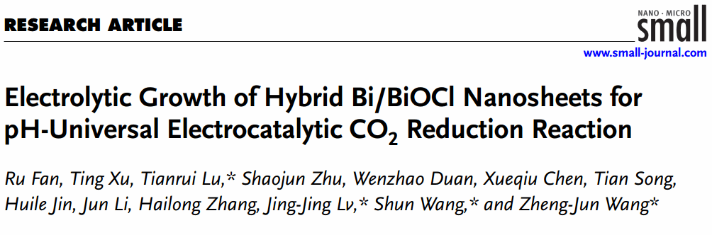该成果以“Electrolytic growth of hybrid Bi/BiOCl nanosheets for pH-universal electrocatalytic CO2 reduction reaction”为题发表在Small期刊(IF=12.1)上。温州大学为第一通讯单位,我校杏吧视频