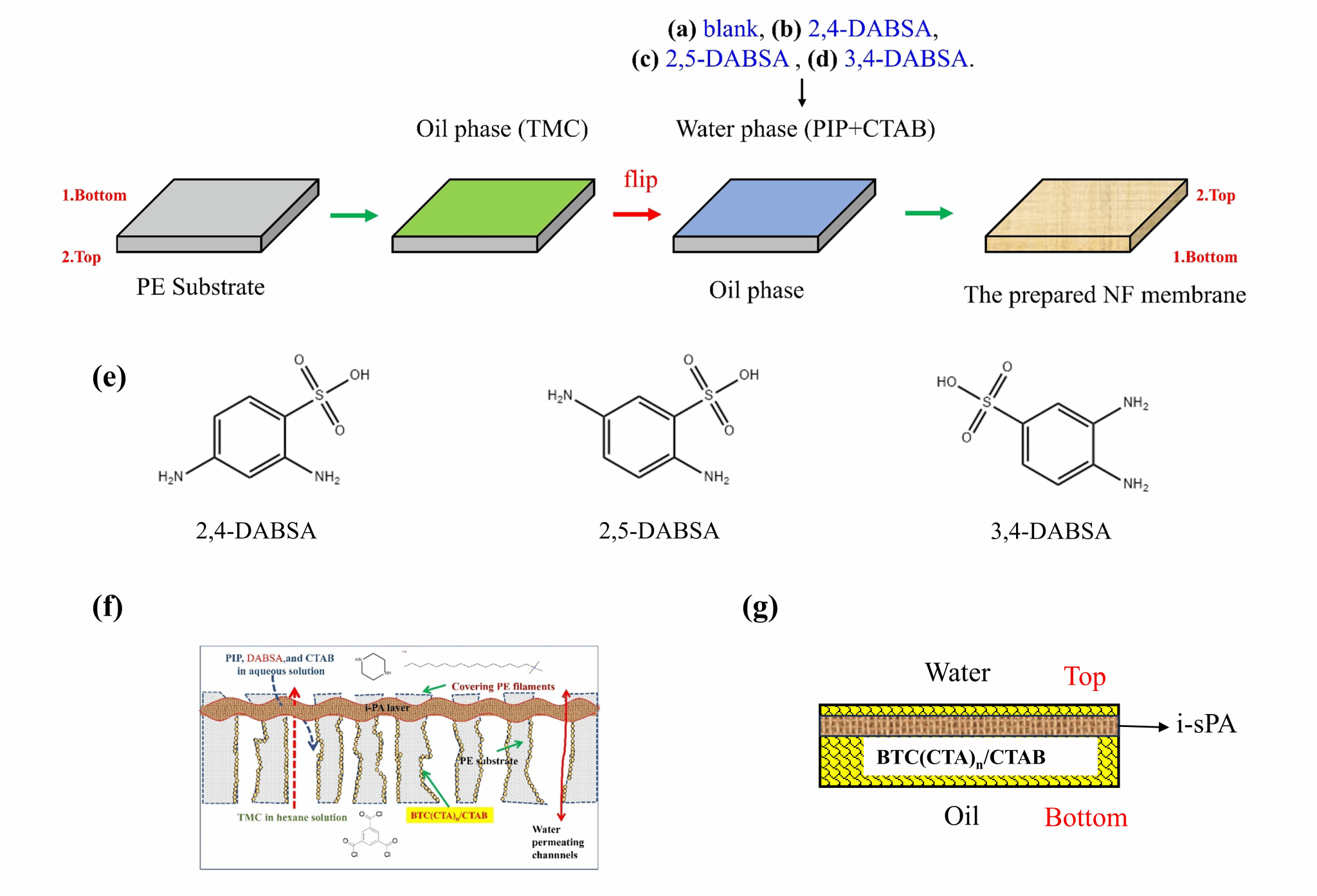 团队将不同二氨基苯磺酸异构体(2,4-DABSA、2,5-DABSA和3,4-DABSA)掺入哌嗪水相溶液中,并与Cross substrate interface polymerization (CSIP)技术相结合,制备了高性能复合纳滤膜材料,成功应用于一二价离子分离领域并取得了优异的性能。分别制备出了三种具有内部约束PA层(i-sPA)的NF膜,携带不同水平的-SO3-基团。2,4-DABSA的竞争反应性高于2,5-DABSA和3,4-DABSA,形成具有更高-SO3-取代率、膜表面更粗糙、更负的zeta电位、平均半径μp (从0.380到0.359 nm)降低,几何偏差减少(从1.44到1.37),导致Na2SO4溶液截留率提高(从93.6%提升至96.5%), NaCl/Na2SO4分离因子SNaCl/Na2SO4(从15.55提升至31.46),纯水渗透率提升(从21.7提升至25.1 LMHB),并且拥有出色的防污性能和长期运行可靠性。系统性研究了两个-NH2基团和一个-SO3-基团取代位对DABSA异构物反应性能和纳滤膜性能的影响,和与CSIP反应机制的相关性。