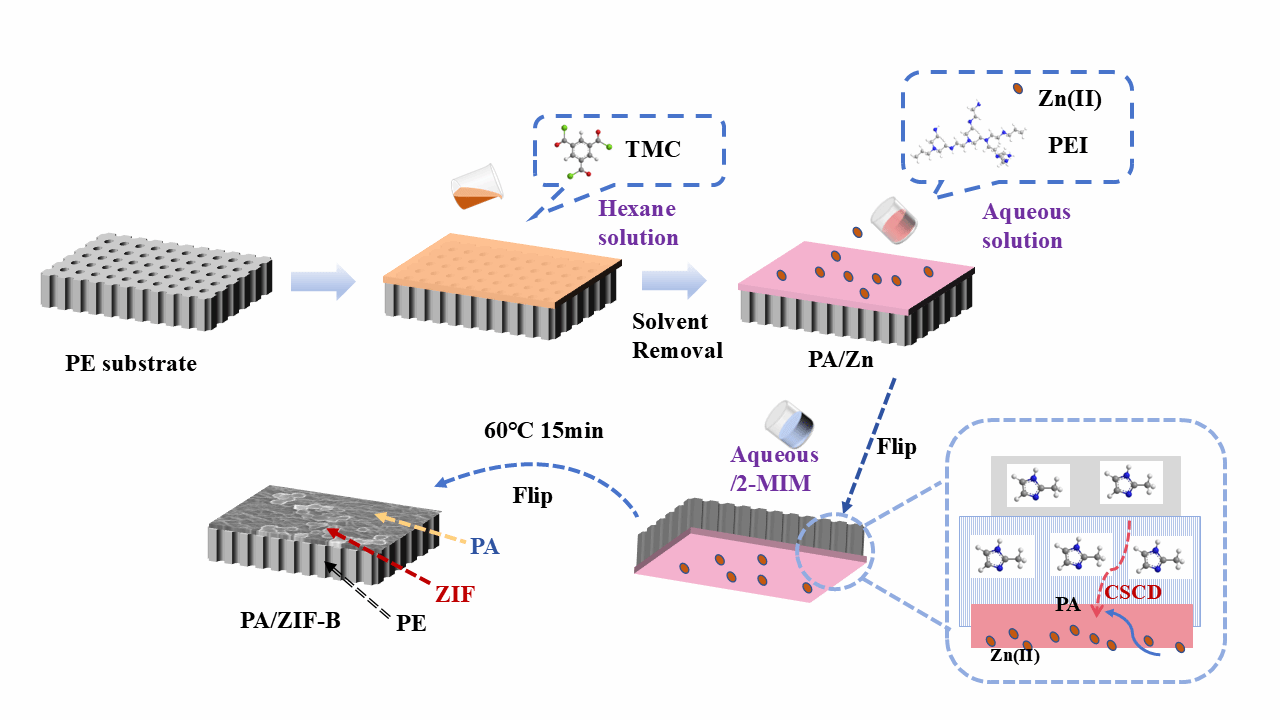 文章旨在解决聚乙烯基聚酰胺(PA/PE)纳滤膜在锂镁分离中存在的渗透通量与选择性权衡问题,开发新型跨基材反向扩散(CSCD)策略原位生长并固定 ZIF-L 粒子;通过研究配体扩散方式对 ZIF-L 粒子生长分布及膜分离性能的影响,明确 CSCD 方法调控膜结构与性能的机理,验证其在突破分离性能上限中的优越性。